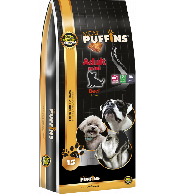 Hrana Ultra Premium pentru caini adulti cu pernute umplute cu carne de vita , miel si ton Puffins Adult Beef, Lamb & Tuna 15KG